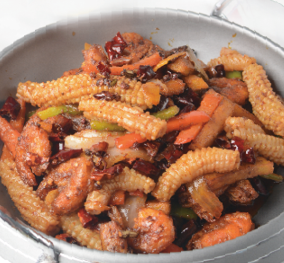 接著放洋蔥碎、芹菜節、青甜椒條、紅甜椒條、滑熟白蝦翻炒均勻,再放魷魚塊,加雞精、蠔油、孜然粉翻炒入味。起鍋前淋入香油、幺麻子花椒油,翻勻即可。