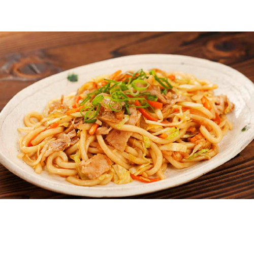 ③接著依序加入高麗菜、魷魚風味天婦羅花、烏龍麵,拌炒均勻。