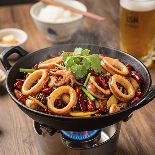 乾鍋魷魚 材料 ◆ 新鮮魷魚 250g(也可用泡發魷魚) ◆ 丁點兒乾鍋醬 20g ◆ 白蝦 200g ◆ 香油10毫升 ◆ 青甜椒條 30g ◆ 幺麻子花椒油 5g ◆ 紅甜椒條 30g ◆ 幺麻子熟香菜籽油 15g ◆ 雞精、蠔油、孜然粉各少許 ◆ 乾花椒粒、乾辣椒節、薑片、蒜片、洋蔥碎、芹菜節各少許 做法 白蝦去頭開背,生粉拍勻,下入5成熟油鍋滑斷生,瀝油待用;新鮮魷魚洗淨,表面剞花刀後切塊,入開水鍋汆斷生,瀝乾水分,再下入8成熟的油鍋裡快速滑油斷生,瀝油待用。 取淨鍋,下入幺麻子熟香菜籽油燒至4成熟,放薑片、蒜片、乾花椒粒、乾辣椒節及丁點兒乾鍋醬炒香。 接著放洋蔥碎、芹菜節、青甜椒條、紅甜椒條、滑熟白蝦翻炒均勻,再放魷魚塊,加雞精、蠔油、孜然粉翻炒入味。起鍋前淋入香油、幺麻子花椒油,翻勻即可。...